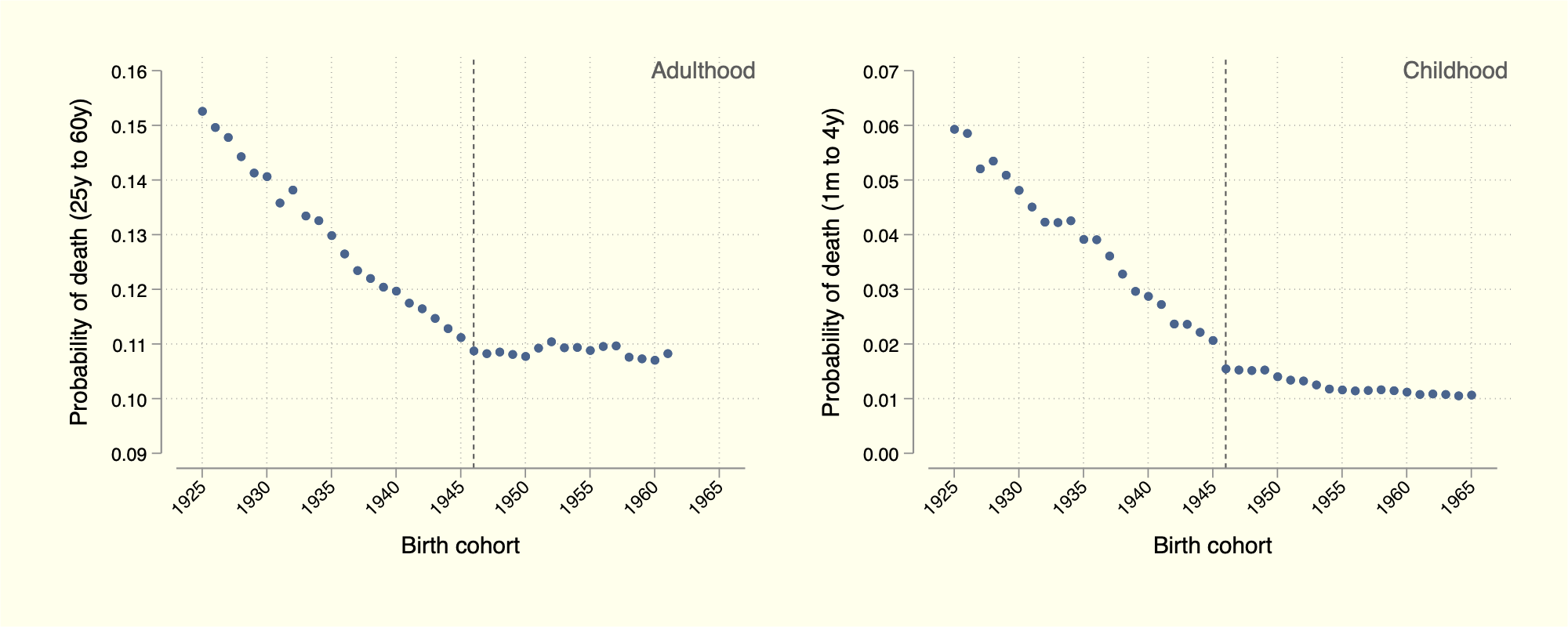 Above: We present adulthood and childhood mortality rates side-by-side for cohorts born in the middle of the 20th Century. The dashed vertical lines reveal that the cohorts driving the stagnation in midlife mortality today drove a similar stagnation in early-life mortality decades earlier, inviting the possibility that current ails reflect “scars” from childhood.