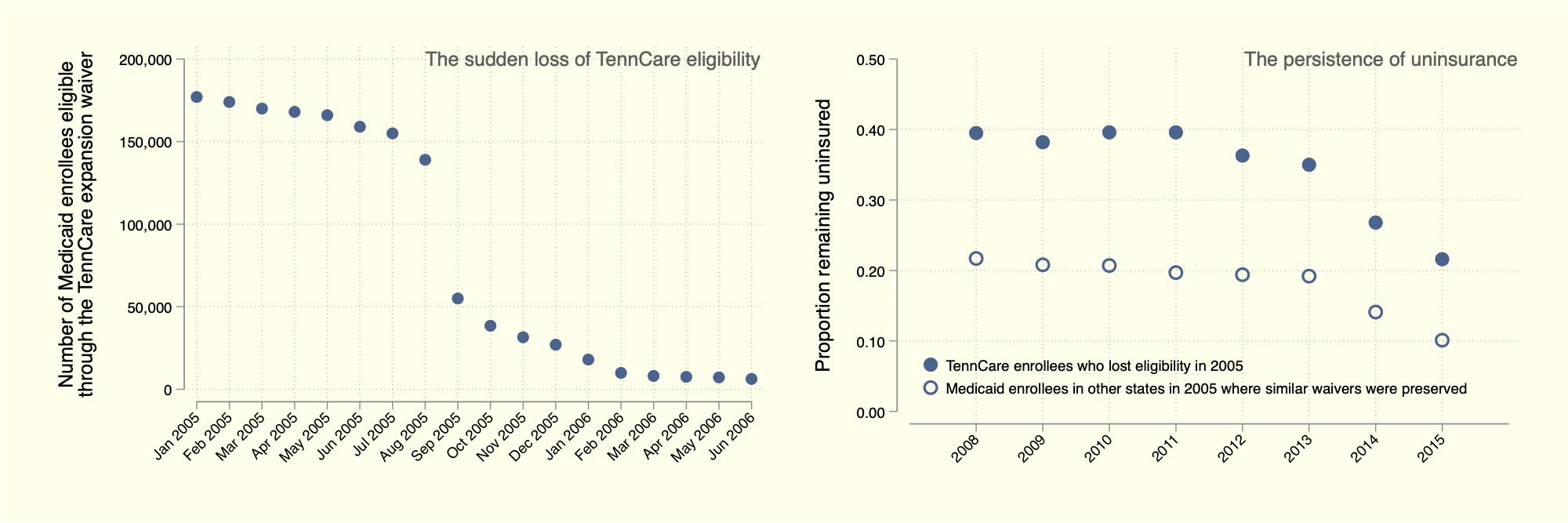 Above: We first illustrate the sudden cut to Medicaid eligibility among working-age adults in Tennessee in the middle of 2005. We then plot the fraction of (i) the “TennCare disenrollees” who remained uninsured many years after losing eligibility and (ii) adults enrolled in Medicaid in 2005 in states where similar waivers for eligibility remained intact.