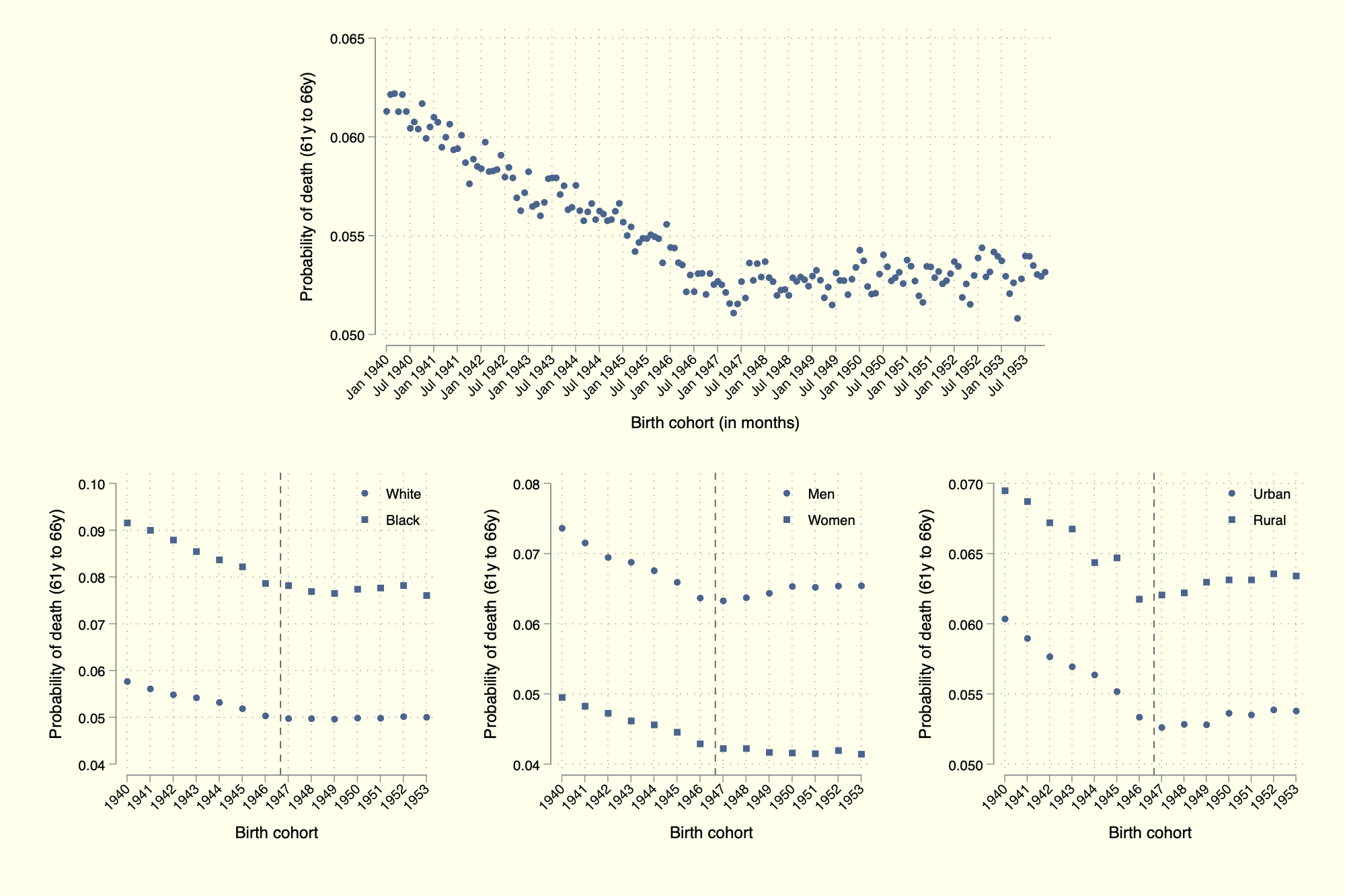 Above: We first plot mortality rates for Americans nearing retirement ages by their month of birth, highlighting the sharpness of their departure from the trend set by cohorts born prior to and just after World War II. We show additionally how pervasive that departure is: We see it (i) among Black Americans just as we see it among White Americans; (ii) for both men and women; and (iii) in dense urban areas as well as rural parts of the country.